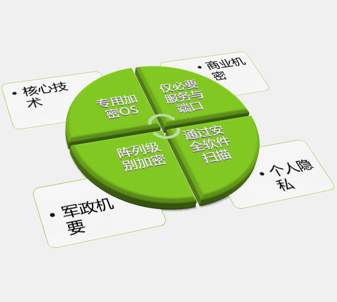 專用嵌入式操作系統 只開啟必要服務和端口 無需用戶安裝 加密OS,非授權用戶無法安裝應用 可支持陣列級別數據加密,硬盤被盜也無法獲取 數據